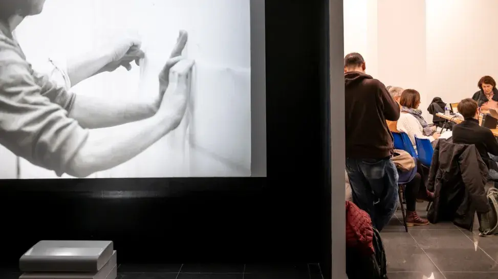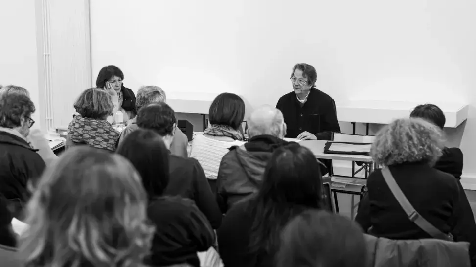 Cet après-midi exceptionnel, à laquelle assistaient de nombreux étudiants de master mais également des proches de Michel Parmentier, a permis d’éclairer l’approche artistique de ce dernier mais aussi les coulisses de la réalisation du film qui avait suivi la création de l’œuvre justement exposée à la galerie Journiac. Alors que le film ne présente quasiment aucun dialogue, Bernard Bloch n’a pu s’empêcher de révéler, non sans humour, que « Michel Parmentier avait aimé le film à 80 % mais qu’il il le trouvait encore trop bavard. »