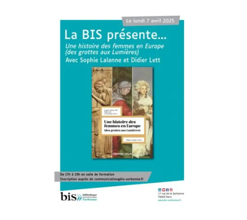 Rencontre Image de couverture Le lundi 7 avril 2025 17h00 19h00 La BIS présente : "Une histoire des femmes en Europe (des grottes aux lumières)" Ajouter à mon calendrier