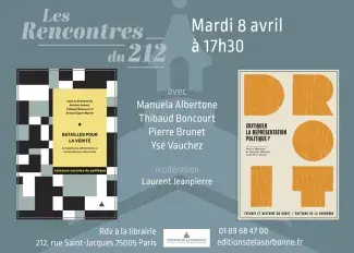 Thibaud Boncourt, Ysé Vauchez, Manuela Albertone et Pierre Brunet seront présents à la librairie des Éditions de la Sorbonne pour discuter de leurs ouvrages Batailles pour la vérité et Critiquer la représentation politique.